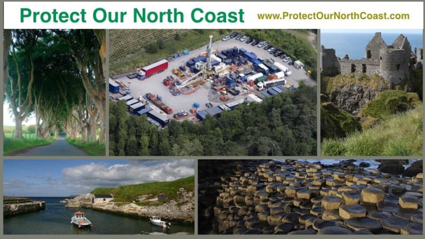 An oil and gas company called Rathlin Energy Ltd has applied to the Planning Service to drill an exploratory oil/gas well at Ballinlea in Co. Antrim, N. Ireland, into the shale layer (Murlough formation) at a depth of 2700m. Their licence area (onshore Rathlin Basin) covers most of the spectacular North Coast from Ballycastle in the East, to Magilligan in the West, and south to Garvagh. They have said if successful they would like to drill 4 wells every square mile for oil. (Many more will be required if shale gas is to be extracted.)